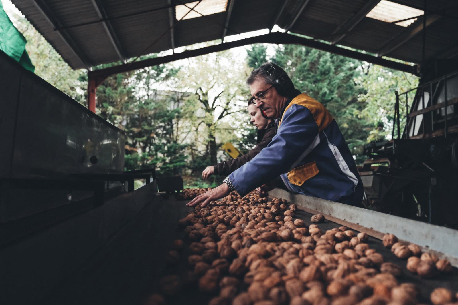 Una vez en el suelo, las nueces se cosechan dentro de las 48 horas, luego se lavan y se secan rápidamente para evitar que se vuelvan rancias. Finalmente, se clasifican manualmente.