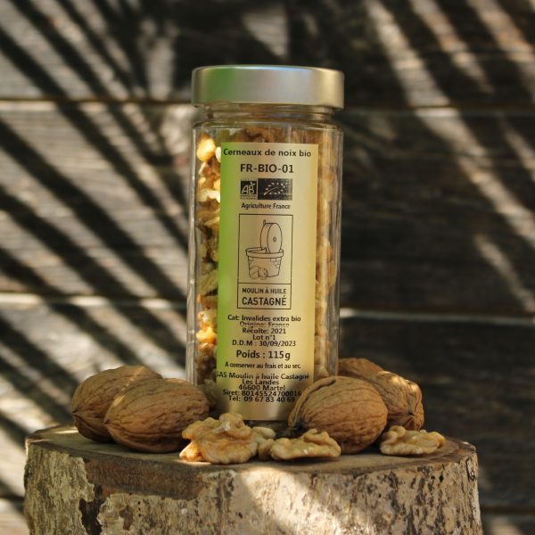 Morceaux de cerneaux de noix bio, catégorie invalides extra, en bocal sous vide de 115 grammes.