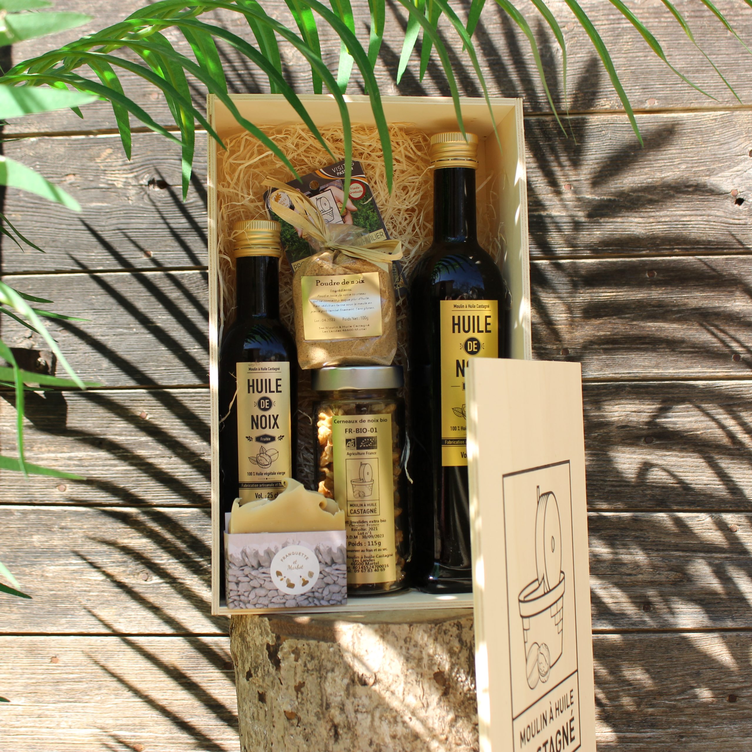 Présenté dans un magnifique coffret plumier en bois, ce coffret est le cadeau idéal pour faire découvrir la richesse des produits à base de noix: saveurs, textures, bienfaits... Un présent unique, qui ravira autant les gourmets que les amoureux du terroir.