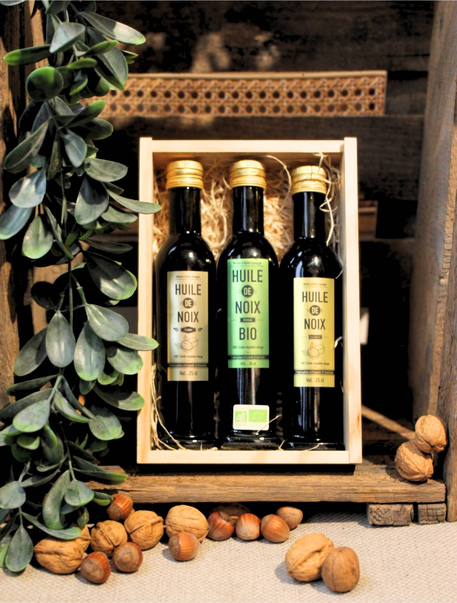 Découvrez toute la palette aromatique de la noix à travers ce coffret élégant regroupant trois huiles artisanales en format 25 cl. Idéal pour offrir, pour initier à la dégustation ou pour varier les plaisirs en cuisine.