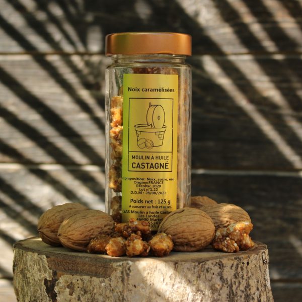 Nos noix caramélisées en bocaux sous vide en 125 grammes. De beaux morceaux cerneaux enrobés de caramel.